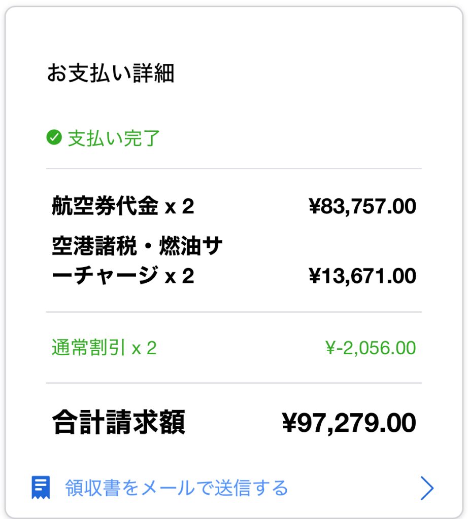 飛行機の予約はagodaでして飛行機代金は二人で97279円で一人当たり48636円でしたね。